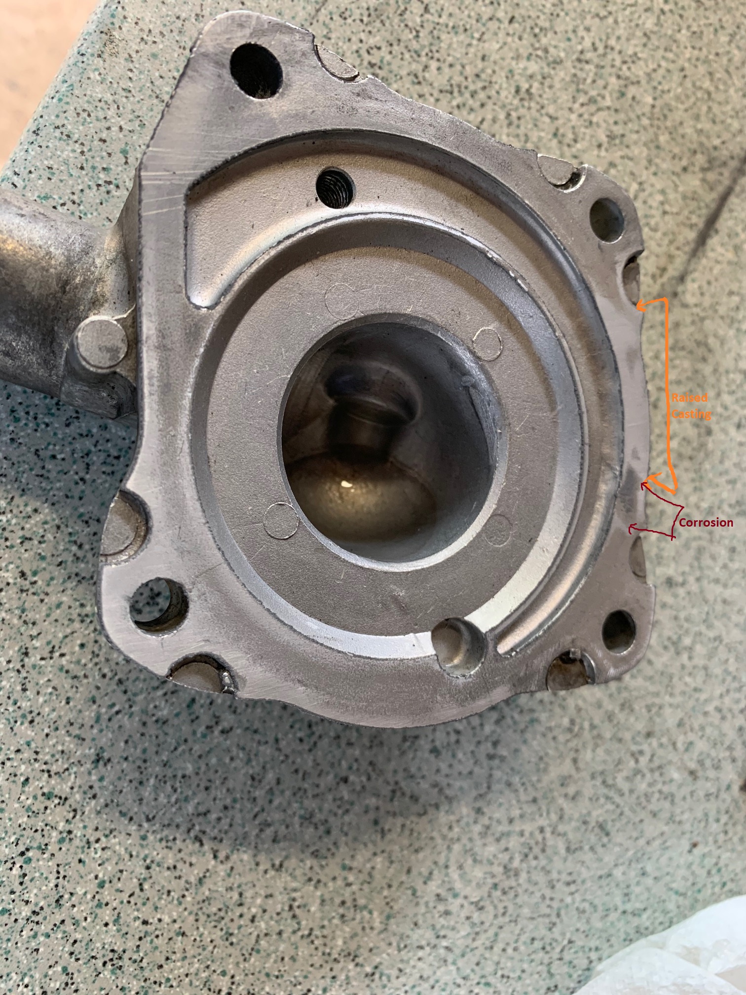 Defective water pump cover. Raised casting right next to dip caused by tiny bit of corrosion. This photo taken after starting to reduce the raised section.